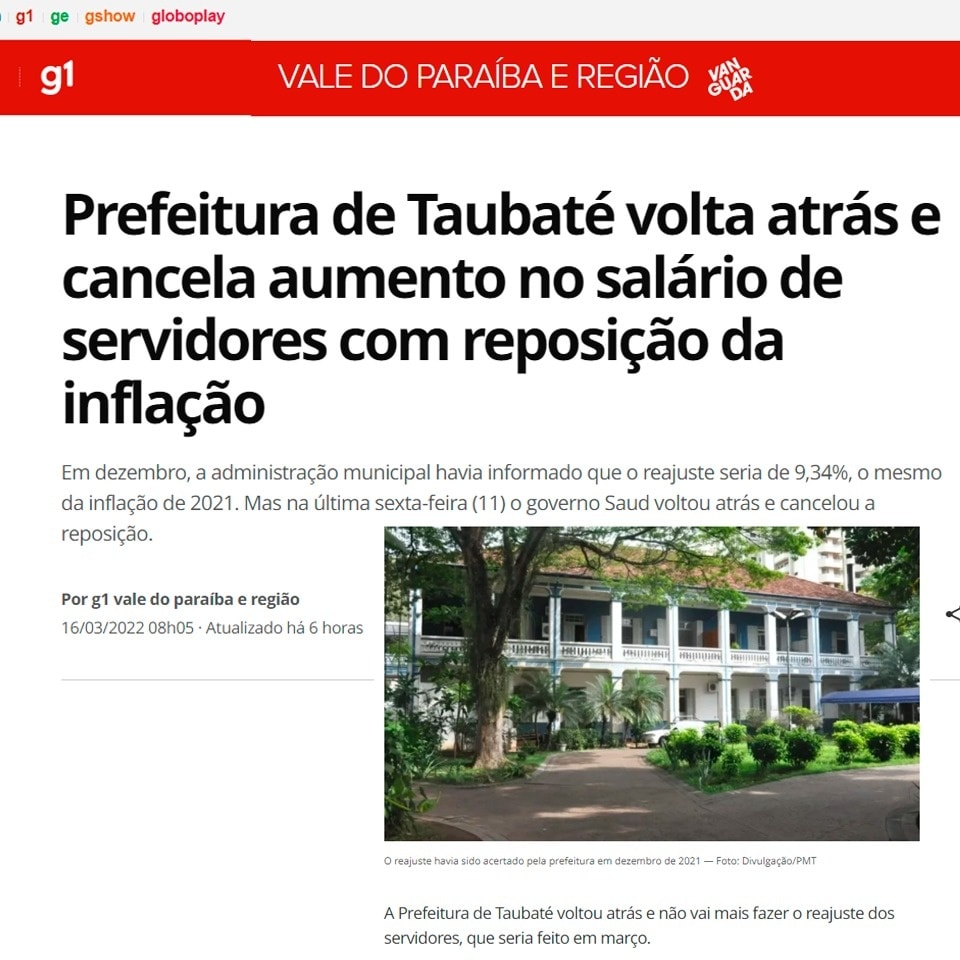 Prefeitura de Taubaté volta atrás e cancela aumento no salário de servidores com reposição da inflação 16 de março de 2022 Leia mais »